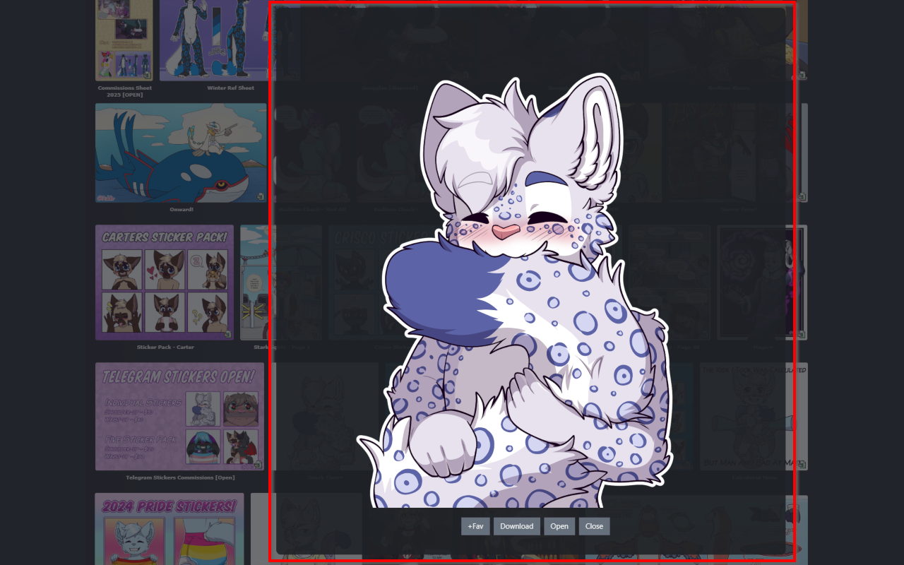 A userscript/browser extension that enhances image viewing on FurAffinity by providing an embedded image viewer. When any submission is clicked, instead of opening the page this script will embedd the clicked image on the current site.