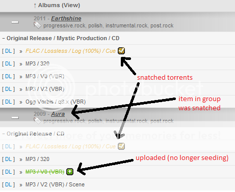 • Snatched/Uploaded torrents you are not currently seeding have a strikethrough.