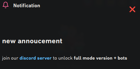 Additionally, clicking the leftmost button on this navigation bar brings up a popup saying that you must join the author's discord server to obtain "full mode version + bots", meaning that this script is not giving you full functionality unless you join the discord server. the script author needs to put an antifeature directive at the top of their script to warn users of this prior to installing their script.