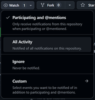 This Tampermonkey script automatically clicks the "Watch" button for you on your GitHub repositories and newly created repositories (including organization repositories you create).