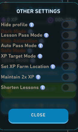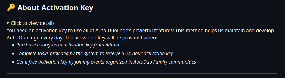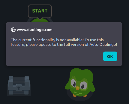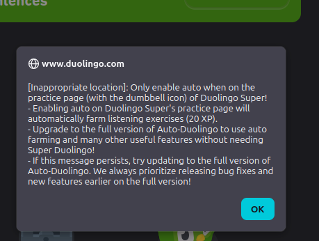 Additionally, when you click on the "start farm XP" button, it says that you must have super Duolingo to farm XP (which you have to pay money for). The only way to farm XP without having super Duolingo is to purchase an activation key from the owners of this script.
